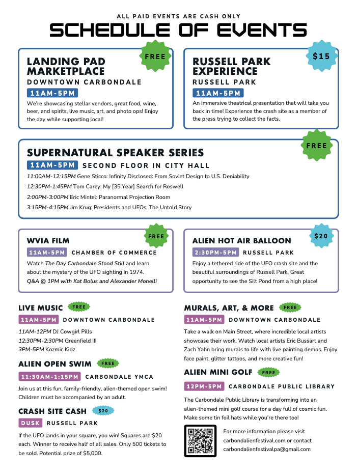 Admission to the Carbondalien Festival is free for everyone! Please note that select experiences — such as the Supernova Concert, Russell Park Experience, Alien Hot Air Balloon Rides, and the Extraterrestrial Express Train Excursion — require separate tickets for entry.